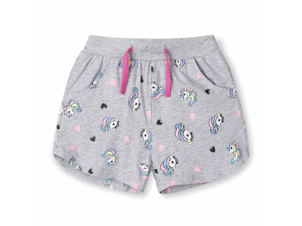 Dívčí kraťasy s gumou v pase a šňůrkou na stažení s motivem jednorožci.
